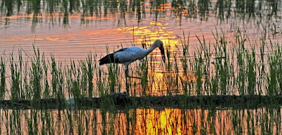An Asian Openbill stork looks for food at sunset in the Morigaon district of Assam estate, northeast India. The Openbill stork feeds on large insects and frogs and always keeps its beak slightly open.